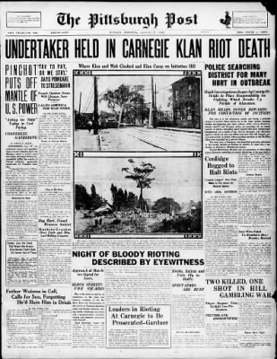 Craig, John M. “”THERE IS HELL GOING ON UP THERE”: THE CARNEGIE KLAN RIOT OF 1923.” Pennsylvania History: A Journal of Mid-Atlantic Studies 72, no. 3 (2005): 322-46. http://www.jstor.org/stable/27778683.