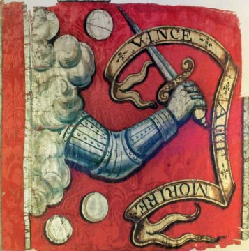 The flag below is known as the Bedford Flag, the picture on the left is the original flag, known to be the oldest complete flag known to exist in the United States. The photo on the right is a flag carried by the Massachusetts Bay Colony Militia during the French and Indian War. It was also carried by the Bedford Minutemen in the Battle of Concord Bridge on April 19, 1775. The inscription “Vince Aut Morire” means Conquer or Die.
