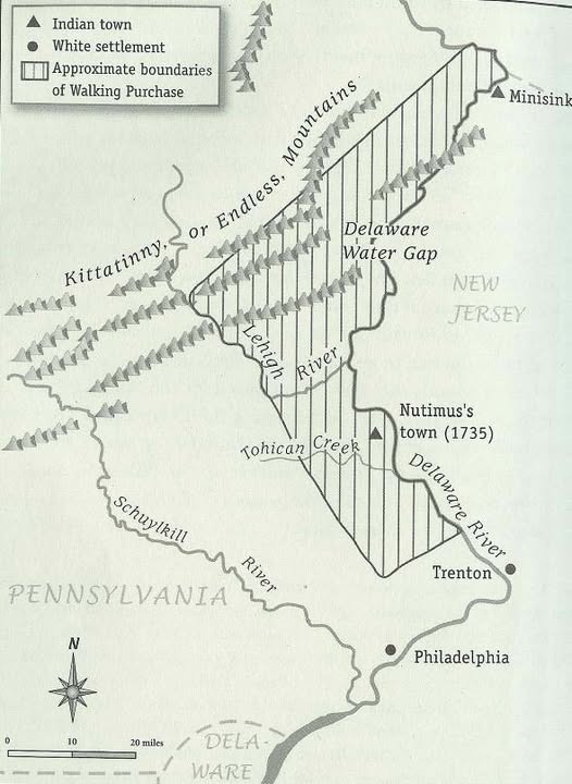 The Walking Purchase was a land deal between the Penn family and the Lenape people in 1737. The Penn family acquired 1.2 million acres of land in Pennsylvania, which was a significant portion of the Lenape’s hunting grounds. The Walking Purchase was a land fraud that led to violence between the Lenape and colonial settlers. In 1737, William Penn’s sons, Thomas, Richard, and John had gained proprietorship of the colony and had been living beyond their means and decided to use their proprietorship to make money by selling more land in the Pennsylvania colony. The Provincial Secretary, James Logan had already been selling land outside what had been agreed to by treaty. Logan was one of the largest land speculators in the colonies and was happy to work with Penn’s Sons to expand the colony. Logan and the Penn’s believed that they needed to extend their authority and provide government oversight in these new settlements. As a result, they considered it necessary to obtain a clear title from the Indians to the land in the upper Delaware and Lehigh River valleys. A document was produced stating that the land grant had been made in 1686 covering the lands that would soon be known as the Walking Purchase.